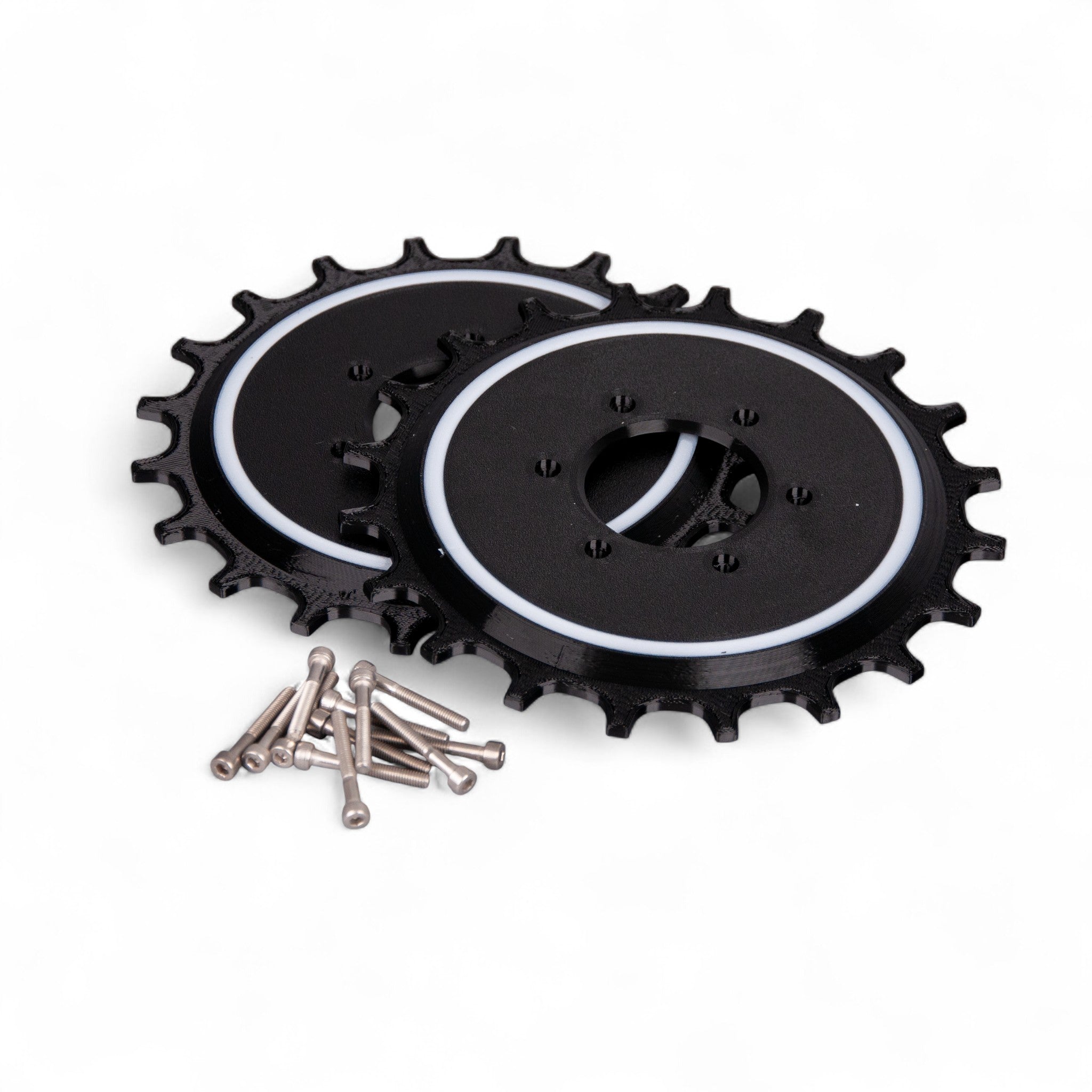To install, remove the original screws, place the covers over the existing wheels, and secure them using the included longer screws in the same mounting holes.